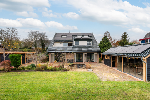 De gehele woning onderscheidt zich door een hoogwaardige afwerking, zoals grote ramen rondom die doorlopen tot vloerhoogte en speciaal ontworpen kasten.